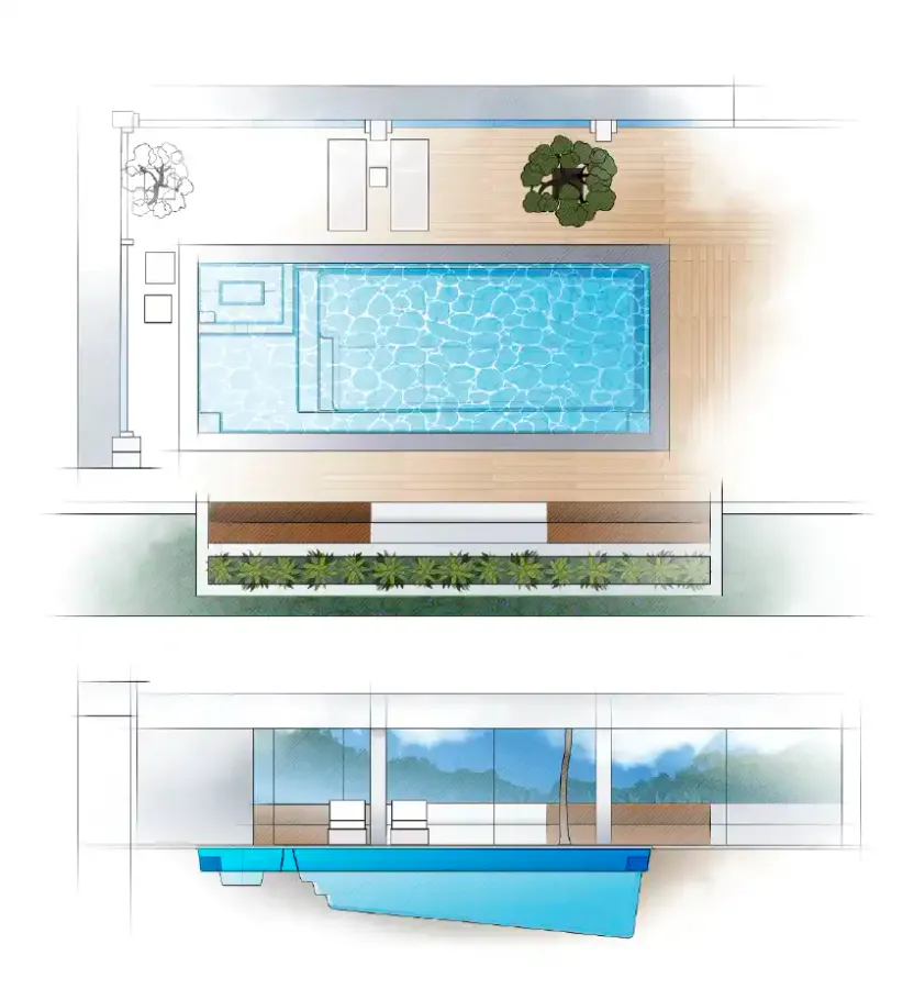 The Intrigue Collection is a masterpiece in design and engineering. It collects all the advantages of today’s modern design and packages it for a complete outdoor living experience. The Intrigue offers the joys of a splash deck nestled against the comfort of a built-in spa which is complemented by a full-length bench alongside a welcoming swimming area.
