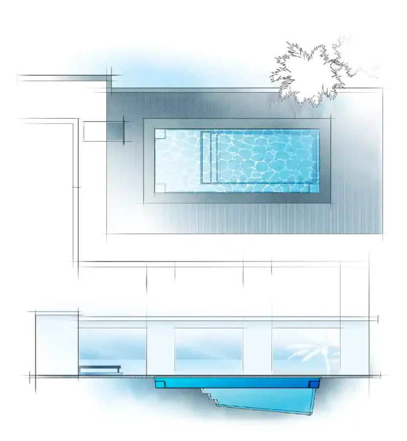 The Ovation Collection is a homage to what many families long for in today’s most glamorous and exciting fiberglass pool designs: a full-width splash pad plus a full-length bench along one side. The real beauty of this design is with its unique sizing to be the perfect addition to a more compact urban environment. It is an opportunity to marry contemporary style with customized landscape design to create your perfect outdoor oasis.