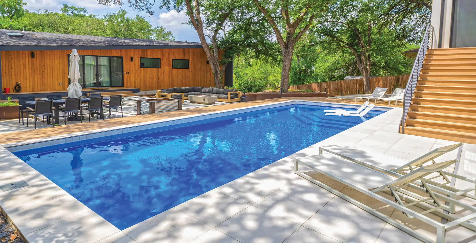 The Vogue Collection was designed for those who enjoy standing out in the crowd and being bold. While the pool design itself is a classic rectangular shape, the entry area features an extravagant splash deck area that serves as the perfect perch in which to relax, play or simply enjoy the view around you. The Vogue offers an end-to-end swimming channel and features a deep end step out seat and bench for easier exit or a moment of rest.